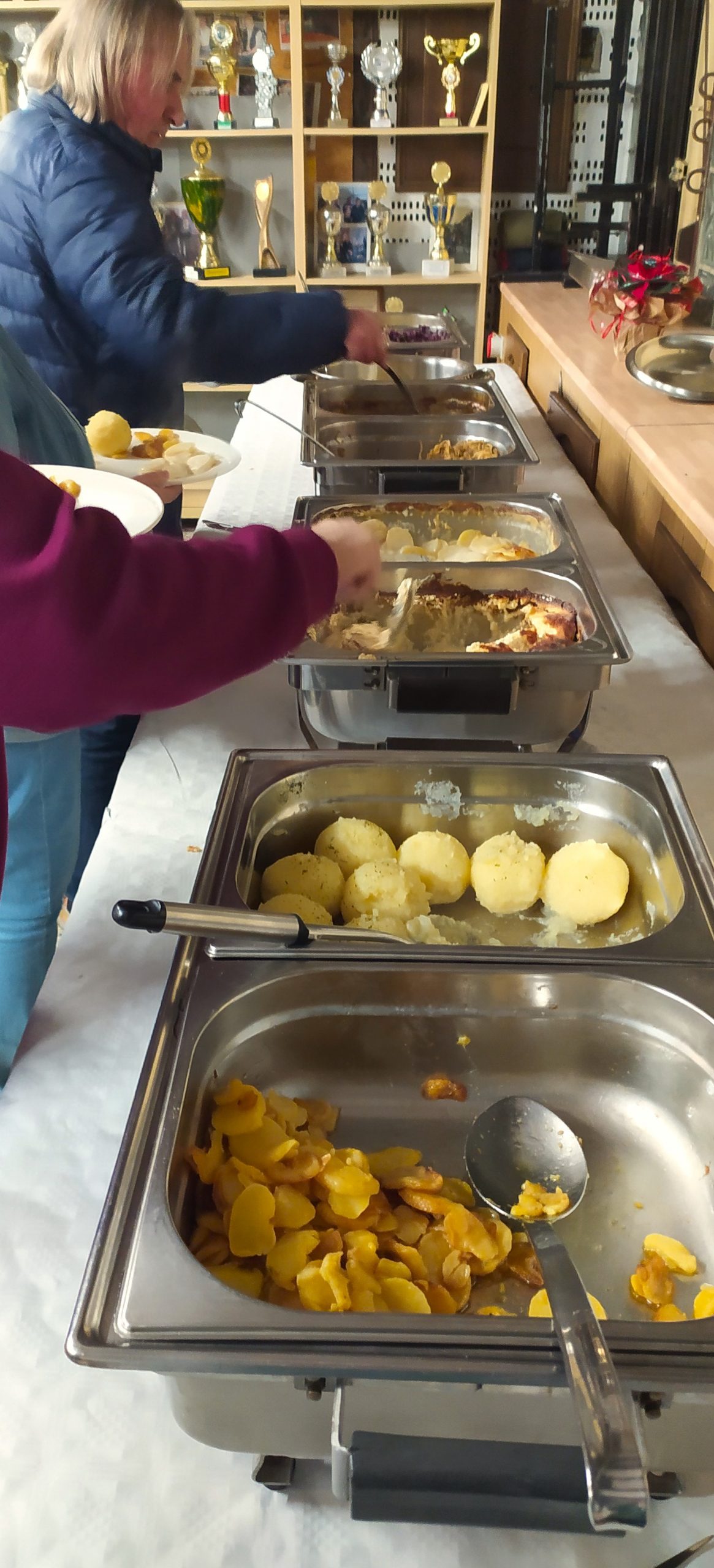 Kulinarisch wurden die Gäste mit einer großen Auswahl verwöhnt: Es gab Spießbraten, Hähnchenbrust, Rinderbraten und Zander. Als Nachtisch wurden eine leckere Schokocreme sowie klassische Herrencreme serviert.